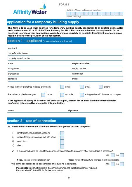 Form 1 Application For A Temporary Building Supply Affinity Water